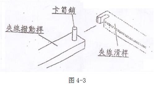 2.上模承座T型槽對準壓著機上模連接頭插入的同時,將卡式模座后部的夾線撥動桿上的卡筍銷對準剝皮部上的夾線滑桿裝入即可,如圖4-3。