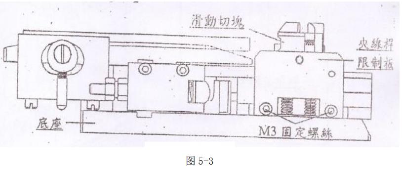 3.將下模夾線桿限制板上的M3固定螺絲拆下,及內(nèi)部滑動切刀座M4固定螺絲拆下即可更換或取出下模各刀片,如圖5-3。