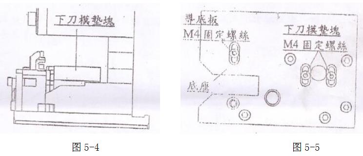 1.需將卡式模底座底部兩個下刀模墊塊M4固定螺絲擰松或取下即可調(diào)整或拆出下刀模墊塊,如圖5-4,圖5-5。