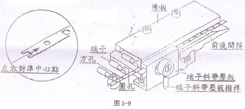 2.將卡式模座上的送料爪調(diào)整至左右對準端子料帶上的圓孔或方孔之中心點,如圖5-9,并放下端子料帶壓板,將卡式模座上的上模承座向下壓,使送料爪將端子往右推至下刀口的正上方(此型卡式模座為后送料方式,送料爪后退時并非一定置于圓孔或方孔內(nèi))。