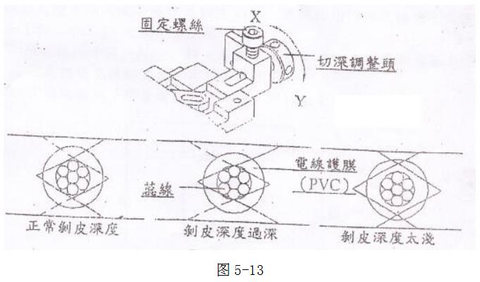 b.剝皮切刀深度太深會切到芯線,易造成芯線斷裂或受損并使剝皮刀壽命減短;剝皮切刀深度太淺易造成電線護膜(PVC)被以強力拉開方式剝離易造成切斷面產(chǎn)生過多毛邊。