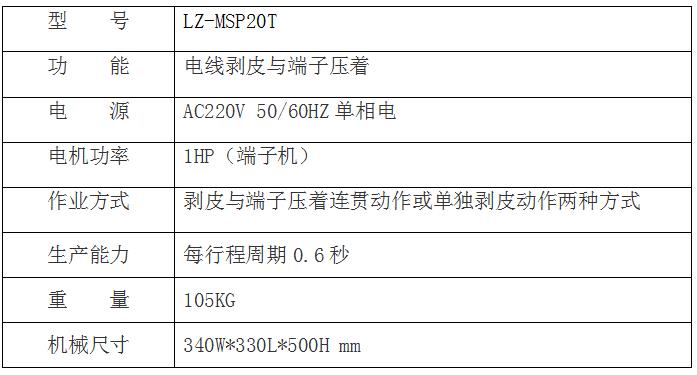 LZ-MSP20T機械式剝皮打端一體機是本公司精心設(shè)計的半自動化機械,主要特點是以電線的剝皮和端子壓著一次性完成作業(yè),改善了早期的先剝皮后壓著端子的工藝流程,同時節(jié)省了人工和工時,提高生產(chǎn)效率,節(jié)省了生產(chǎn)成本。